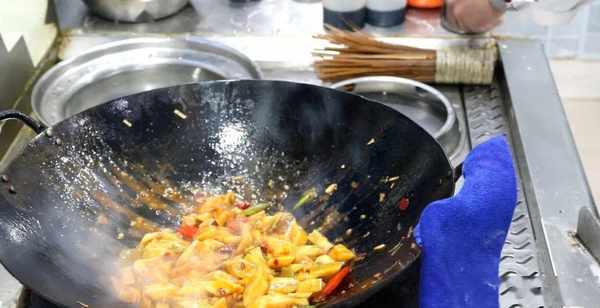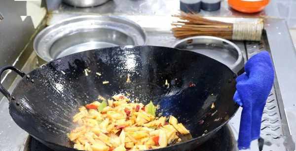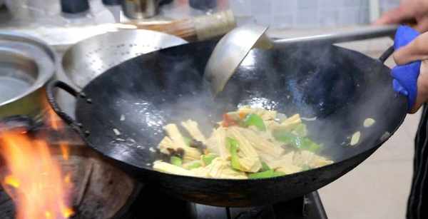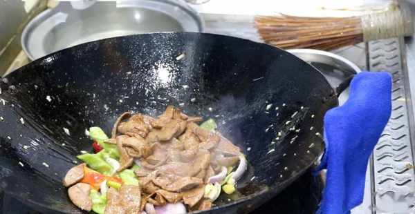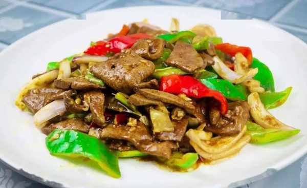 锅内再添入少许食用油,倒入辅料翻炒,炒出香味,再倒入青红椒和洋葱。开大火快速翻炒30秒,再倒入滑油后的猪肝,淋入刚才调好的料汁,快速翻炒均匀,15秒后即可关火起锅装盘。