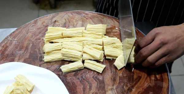 提前泡发好的腐竹8两左右,切成3厘米长的段,放入盘中备用。