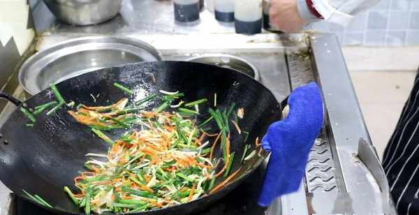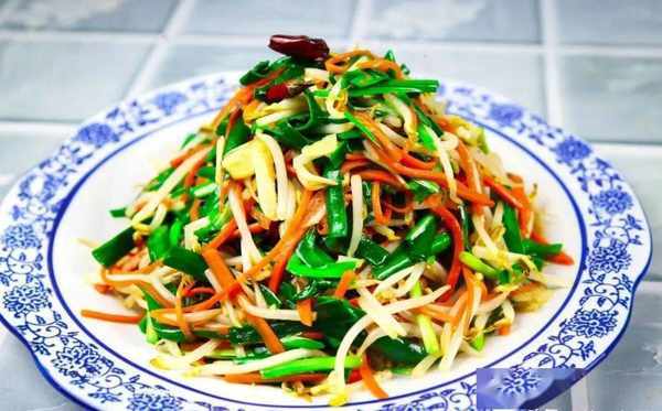 另起锅添入半勺食用油,油热后倒入蒜片和红干椒爆香,加入蚝油5克,倒入胡萝卜丝,快速翻炒几下,倒入绿豆芽翻炒片刻,炒至豆芽断生后,倒入韭菜段,翻炒10秒钟以后,起锅撤火开始调味。