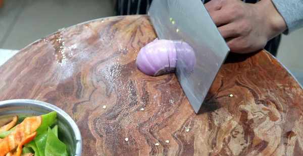 准备青椒两个切成菱形块,红椒同样切成菱形块,和青椒放在一个盆中,用来配色。洋葱半个,切成条,用手抓散,和青红椒放在一起。