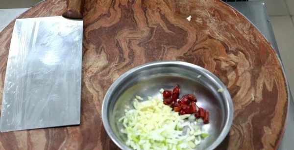 大葱一段切成马蹄块,大蒜两粒切成蒜片,放入盆中,再抓入一小把红干椒备用。