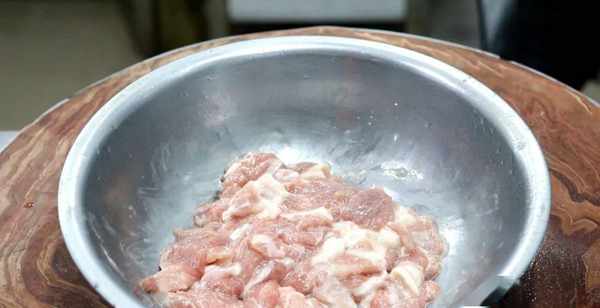 然后把肉片捞出,挤干水分,再放入盆中,下面开始腌制肉片: