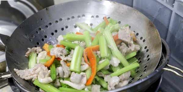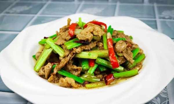 炒锅烧热倒入食用油,油温四成热时,下入肉片,滑油15秒,倒入芹菜和红椒。10秒钟后即可倒出控油。