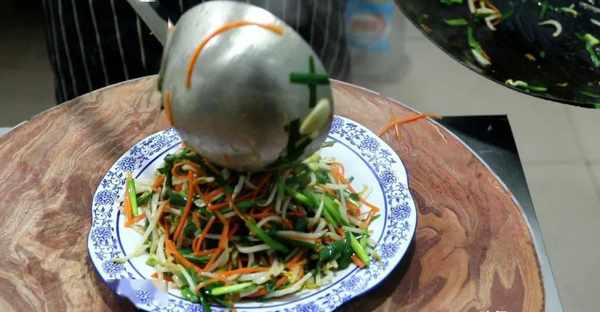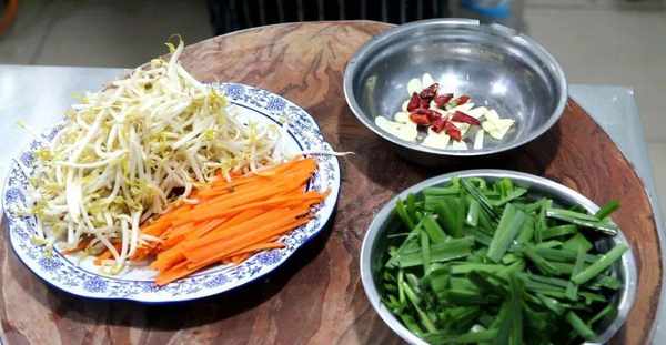 洗净的绿豆芽三两左右,和胡萝卜放在一起,韭菜一小把,切成三厘米长的段,放入小盆中备用。