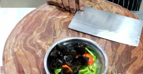 青椒2个切成菱形片,红椒半个同样切成片,和青椒放在一起用来配色,泡发的黑木耳一小把,一起放入盆中备用。
