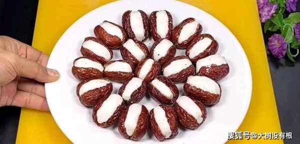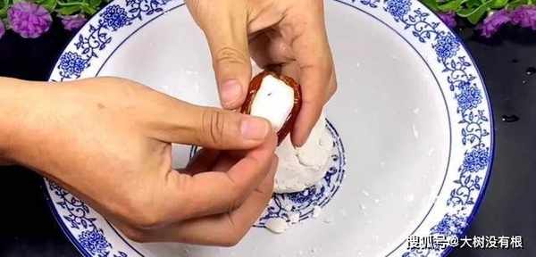 4.取一颗去核的红枣,将糯米条塞进大枣中,捏紧捏实。