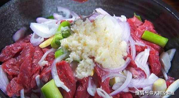 2.大葱切段,生姜切片,洋葱切丝,放入牛肉中。