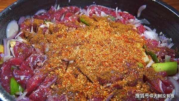 7.倒入牛肉中,再倒入一勺辣椒面,继续腌制2小时。