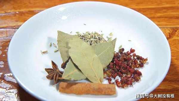 4.准备2个八角、一把花椒、一把小茴香、一小块桂皮,3片香叶,洗净后沥干水分。