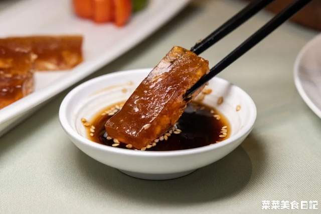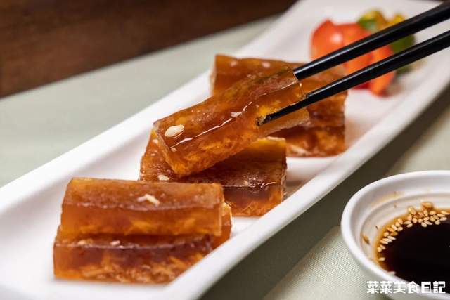 颜值这块真的没得说,雪花纹覆在黄鱼冻上方,漂亮得像琥珀一般。