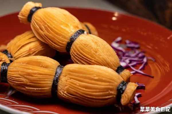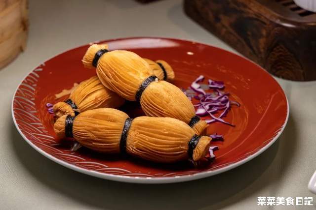 造型别致,外仿藕节形状,内用松茸和藕丝调馅炸制而成。