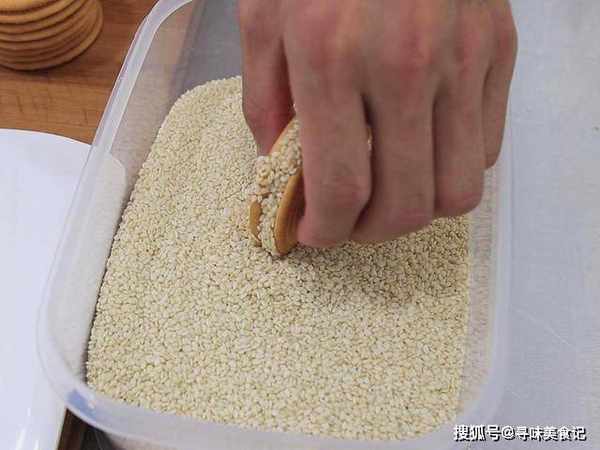 舀一勺南瓜馅放在饼干上,另外拿一个饼干放在上面。两个饼干把南瓜泥夹在一起,用勺子抹去多余的南瓜馅。南瓜饼的边缘均匀地粘上芝麻。