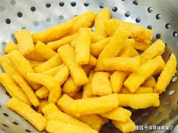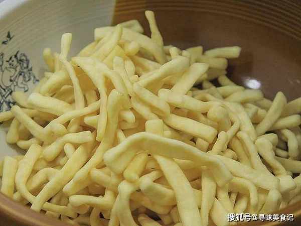 锅内烧油,油温5成热时,把切好的窄条撒入锅中,用筷子不停地翻动,变色且漂浮在油面上捞出控油。