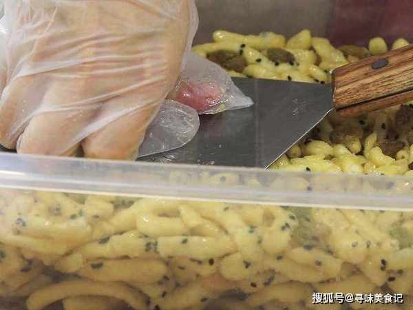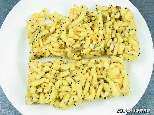 不停翻动让面条均匀裹上糖浆,再撒上一点黑芝麻、葡萄干或者坚果翻匀后将面条倒在提前准备好的保鲜盒中按压结实,再放上一层葡萄干,冷凉以后切成小块,摆放在盘中即可食用。