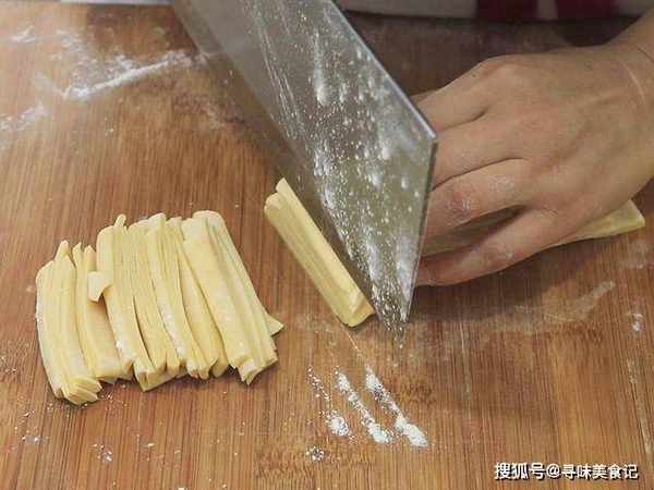 醒好的面团擀面杖擀成1厘米厚的圆形面片,切成5厘米左右的宽条摞起来,再切成1厘米左右的窄条。