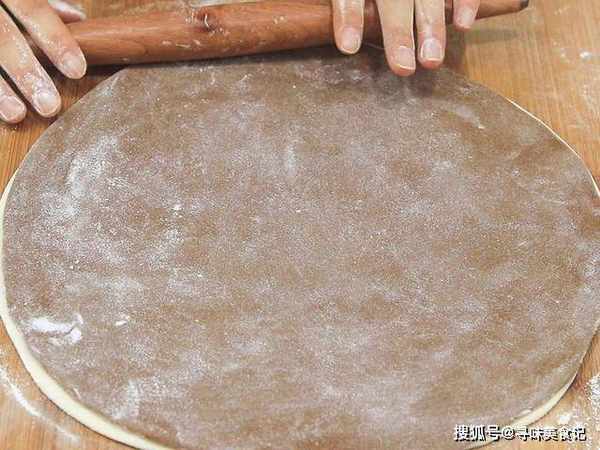 20分钟以后,把红糖面团擀成圆形的面皮;再把小麦面团擀成和红糖面团一样大小的面皮。两种面皮叠在一起,从下往上卷成长条,然后从中间切开,放到冷冻室1小时以上。
