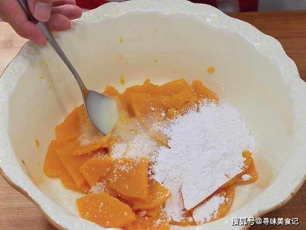 在南瓜中放入炼乳8克、白糖10克、糯米粉30克,用勺子把南瓜捣碎,顺着一个方向搅拌成糊状即可。