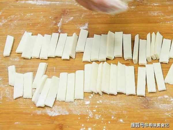 在案板上撒上一点面粉,把糯米面团擀成0.5厘米厚的片,用刀切成一个一个的粗条,撒上干面粉防粘。