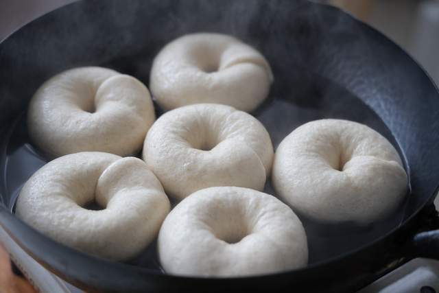 6、锅中水微微煮开,喜欢甜的加50克白糖,我习惯直接煮,贝果丢进去,每一面煮30秒左右;