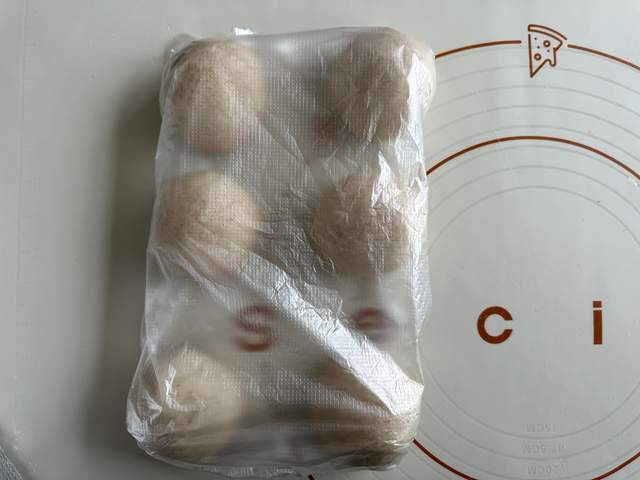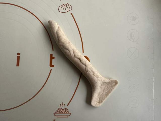 4、另一头包起来捏好接口,这个接口一定要反复捏紧,不然煮的时候会炸开。最后把借口的部分整理到底部。我们贝果生胚就做好了;