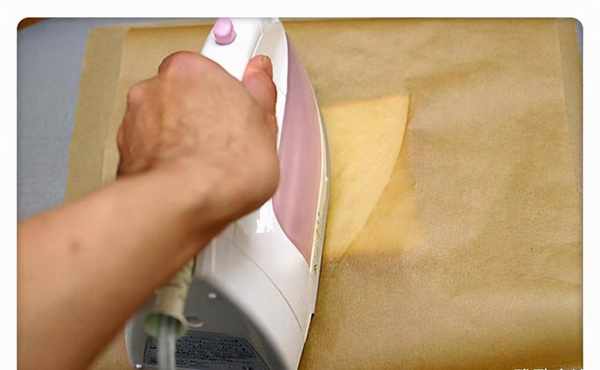 首先需要准备两张烘焙纸,先在熨衣板上铺一张烘焙纸,然后把吐司放在烘焙纸上,再铺一层烘焙纸。