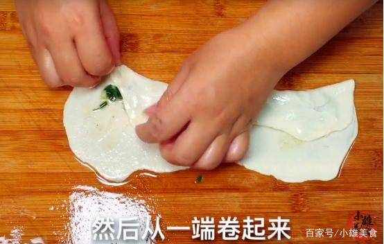 4、将案板清理干净后,在上面抹上适量的食用油,然后把松弛好的面剂子取出,向外拉伸后,并用擀面杖将其擀薄。同时把准备好的葱花,均匀的摆放到面剂子中间,并用手将其向内进行收卷,将葱花卷入其中。然后再制作一条相同的面剂子,每两条为一组向内收卷,并挤压平做成面胚备用。