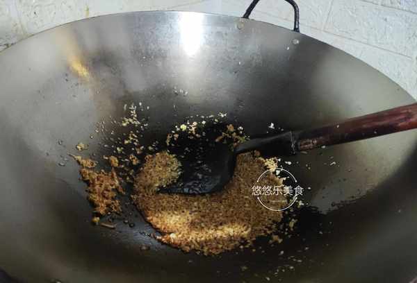 13、将蒸好的面粉倒入油锅中。如果有结块,请用铲子将它们打碎成粉末。