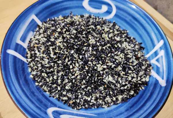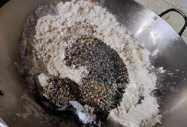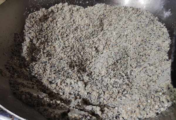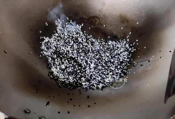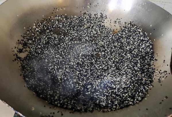 4.在蒸煮面粉的过程中,我们来准备一下炒好的芝麻。炒完芝麻香,不易碎。炒芝麻的时候,锅里加少许油润一下,这样锅就不容易糊了。