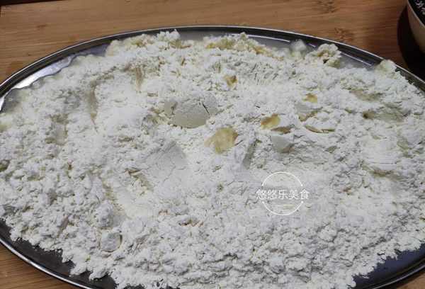 10、面粉放入锅中蒸10-15分钟,取出待用。(蒸面粉的时候忘记盖保鲜膜,蒸的时候边上有点湿,朋友们记得包保鲜膜)