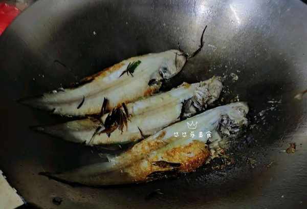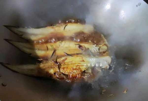 7、将鱼翻面煮1-2分钟左右,加入适量的酱油,因为刚开始煮的时候酱油已经倒了,所以现在可以不加了,以免煮过头了。太咸了。