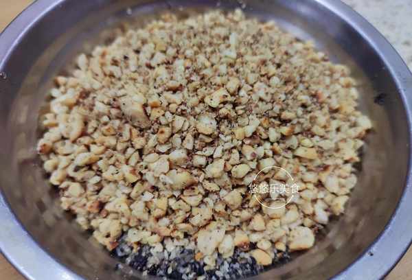 15.倒入芝麻片和花生米,然后用锅铲搅拌均匀。