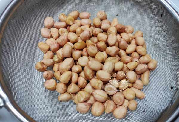 8、现在准备花生也是这个道理。炒之前先在锅里放油,用小火慢慢煎,炸至熟,盛入锅中待用。当坚果稍微冷却时,去除坚果上的皮。