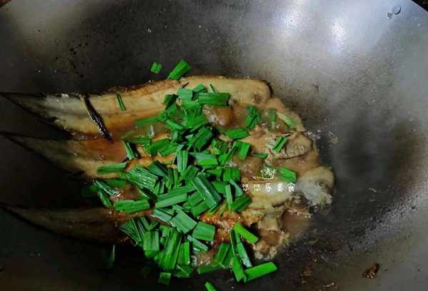 9、鱼用番茄酱水煮过后,入味好,软滑,鲜美。收汁少许后,可以加入切碎的蒜叶,用文火炖30秒,即可出锅食用。