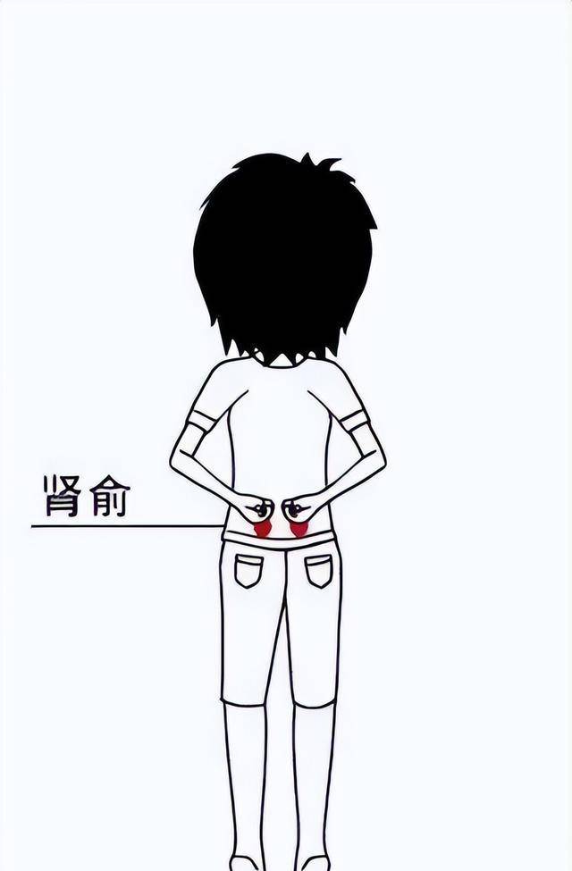 两脚分开与肩齐宽,踮起脚尖,双膝微曲,双手虚握拳,贴在下图位置,利用膝关节的上下抖动进行反复摩擦,直到腰部轻微发热为止。