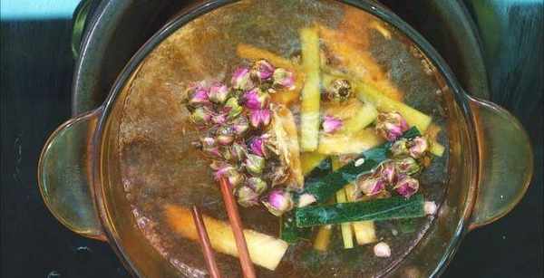 2、锅中烧水,放入冬瓜皮瓤和玫瑰煮5分钟,最后加入两片柠檬即成。