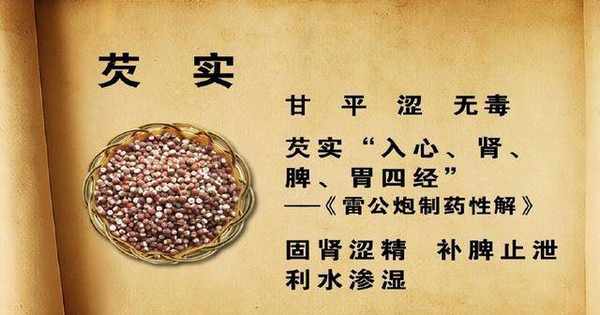 芡实甘补涩收,入肾经可以用于肾气不固的腰膝酸软,肾虚遗精、早泄,又固肾缩尿治疗尿频和小儿遗尿。