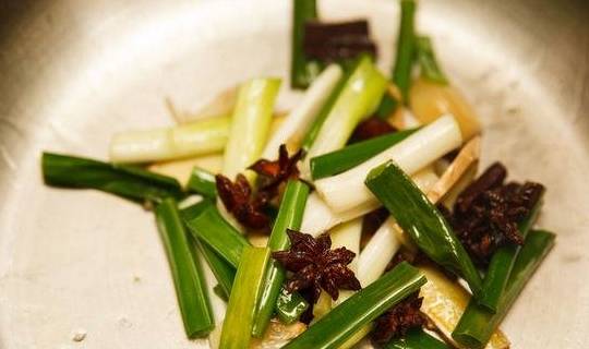 Step3.接着在锅中放入少许的油,将八角与桂皮下锅爆香后,倒入葱、姜、蒜炒香。一锅到底直接在快锅里做翻炒后直接放入其他材料做烹煮。