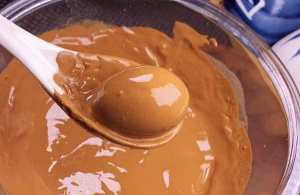 第三步:将提前准备好的皮蛋粉打开(皮蛋粉我买的一包150克,三包的话是450克)倒入到盆中,然后加入食盐30克搅拌均匀,再将之前煮制好放凉的茶水倒入到皮蛋粉之中搅拌成糊状,放置到一旁登上大约60分钟的时间。(这里要注意的是搅拌皮蛋粉的时候一定不要弄到身上或者手上,因为皮蛋粉是提前配好的,里面含有石灰小心烫伤皮肤)