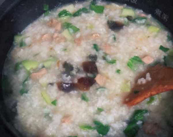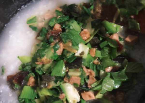 7.把炒好的菜放入粥里搅拌均匀,根据自己的口味放入少许盐搅拌均匀就可以开吃了。