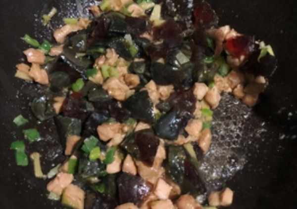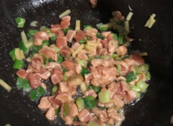 4.放入刚才腌好的肉丁炒熟。