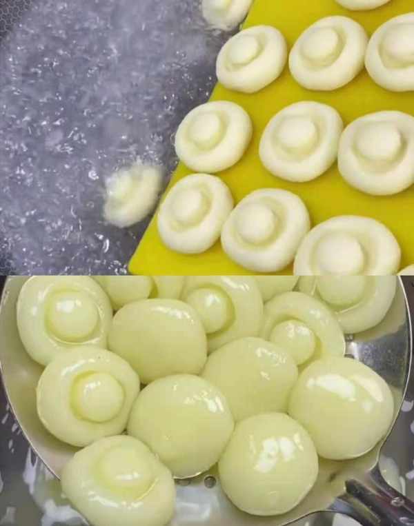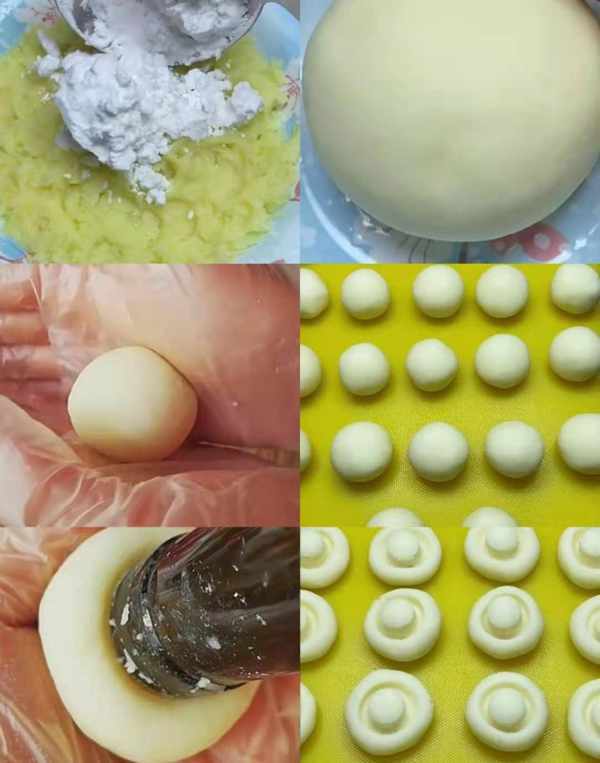 再放入两勺土豆淀粉,和成光滑的面团,揪一块面团用手搓成圆球状,再用瓶子口压成蘑菇的形状。