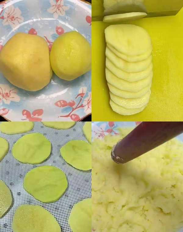 土豆您别总炒着吃炖着吃,今天分享土豆新吃法Q弹好吃,喜欢的家人一起做。首先准备两个土豆清洗干净去皮,改刀切成均匀的薄片,然后放入蒸锅上屉蒸熟,用擀面杖捣成泥。