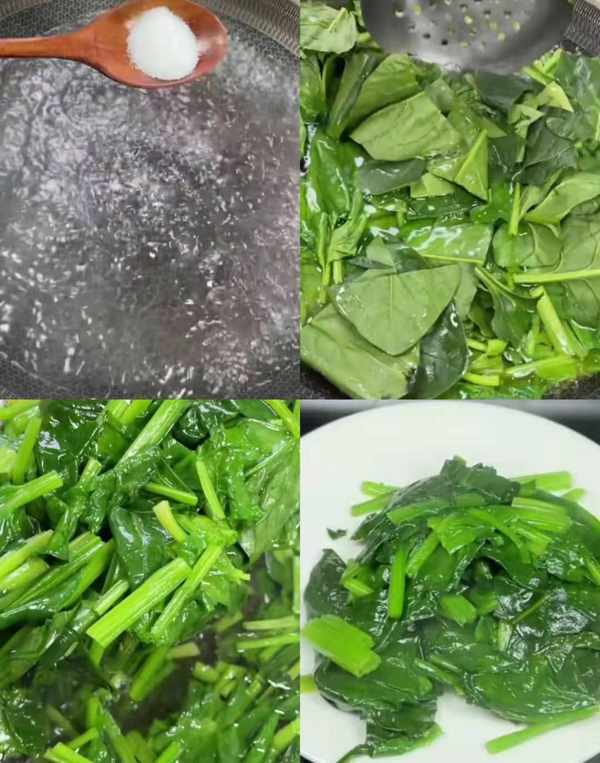 起锅烧水,等待水开加入少许精盐,加入少许食用油,加入油盐能使青菜烫出来颜色更加靓丽漂亮,放入切好的菠菜段焯烫五十秒捞出控水。