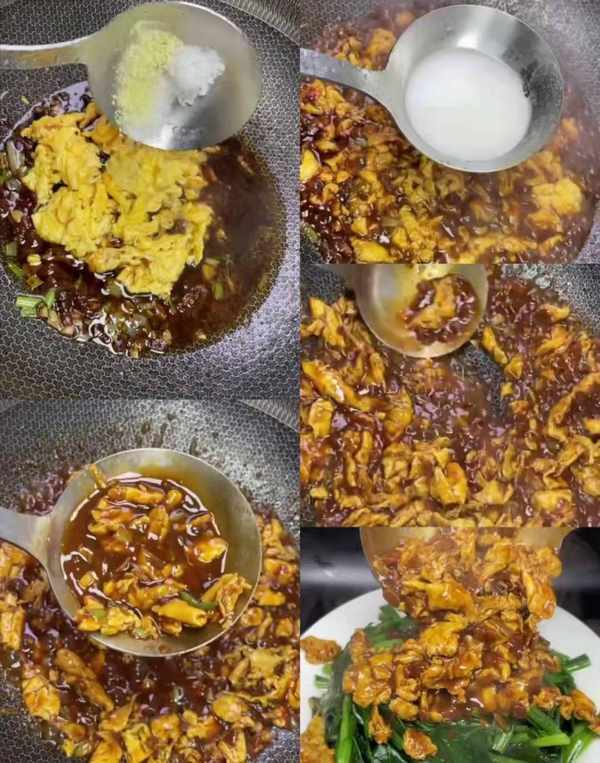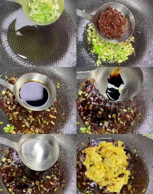 另起锅烧油,等待油热放入切好的葱花,放入切好的蒜末爆香,放入少许黄豆酱炒出酱香味,放入少许生抽,放入少许酱油,放入少许老抽调颜色,加入一大勺忘情水,下入炒好的鸡蛋。