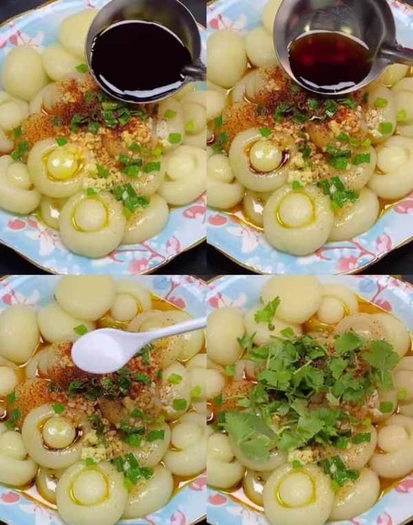 原料:土豆、土豆淀粉、蒜末、葱花、辣椒面、生抽、陈醋、精盐、香菜