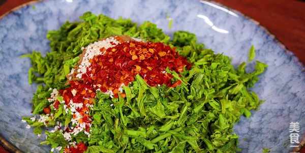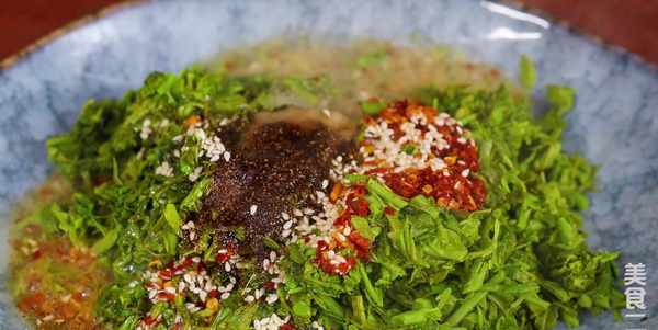3、在香椿丁上面放食盐、花椒粉、白芝麻、辣椒粉,用大料熬的调味油泼上去,激发出所有调味料的香味,搅匀之后即可食用。