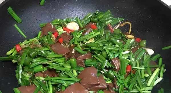 然后将鸭血放入锅中,放少许蚝油、生抽、精盐、鸡精、味精,大火煎一分钟即可出锅食用。韭菜气味浓烈,男人常吃,精神饱满。