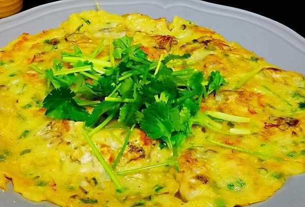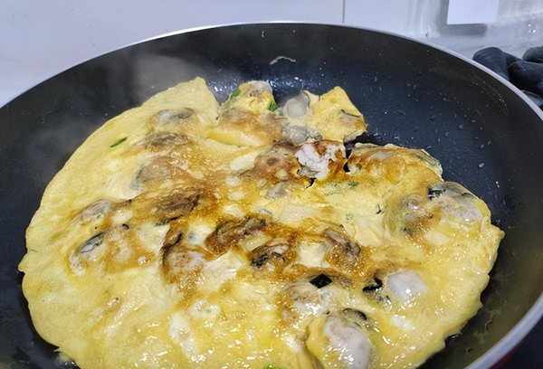 然后烧热锅,加入少许油,将牡蛎蛋放入锅中。一面煎好后,再煎另一面。两面煎好后,就可以拿出来吃了。