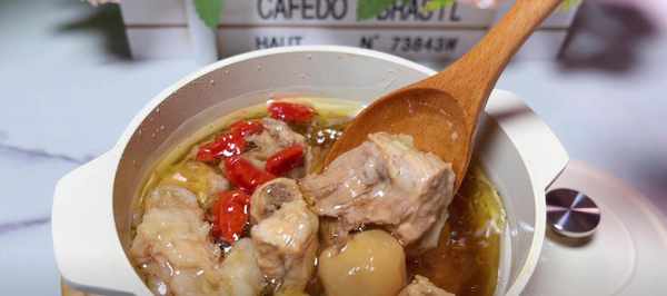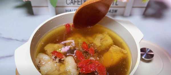 4、时间到了,打开锅盖,在汤里加入少许盐和枸杞,用勺子搅拌均匀,就可以喝了。