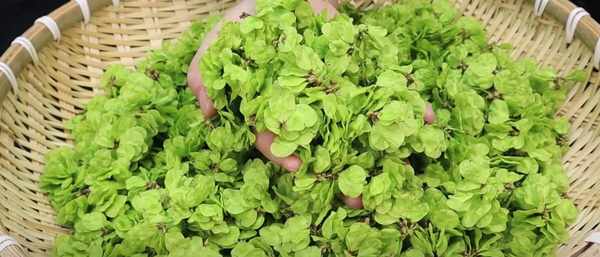1、准备榆钱两三斤。清洗前,先将黑榆钱清洗干净,否则蒸出来的味道会很不好。